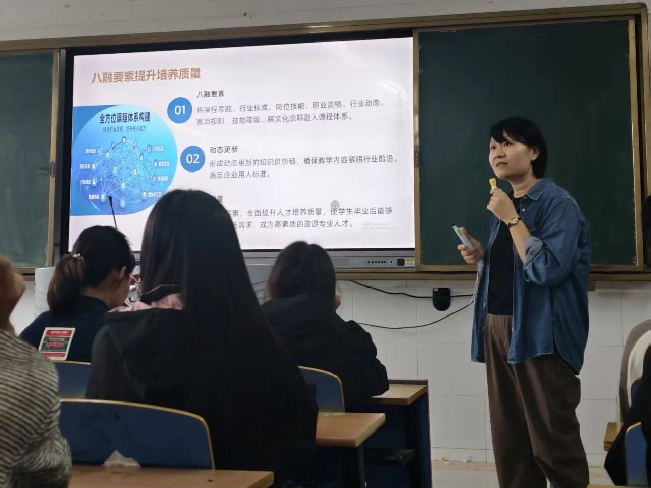 旅游管理专业教研室主任丁琳老师围绕“乘文旅新浪潮,成未来文旅人”展开讲解,旅游管理专业以本地文旅资源为依托,聚焦行业数字化转型需求,设智慧文旅运营、文旅IP与体验策划、文旅新媒体营销三大方向,培养“懂运营、会讲解、精数据”的复合型人才。
