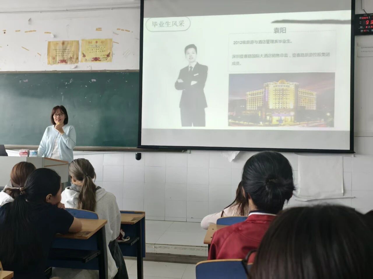 酒店管理与数字化运营专业教研室主任张彩红老师首先对本专业进行了介绍,该专业是全国首批百所高职现代学徒制试点专业、省级特色专业,采用“三阶四维双驱”人才培养模式,建立“岗证赛课”融合的课程体系,实习实训资源丰富,与国内多家知名酒店集团合作开展“订单式培养”。之后,请该专业2名优秀毕业生代表分别通过视频和现场讲解的方式,畅谈在校期间的学习经历与成长感悟。寄语学弟学妹,珍惜在校时光,夯实专业基础,锤炼实践能力,不断实现自我突破与成长。
