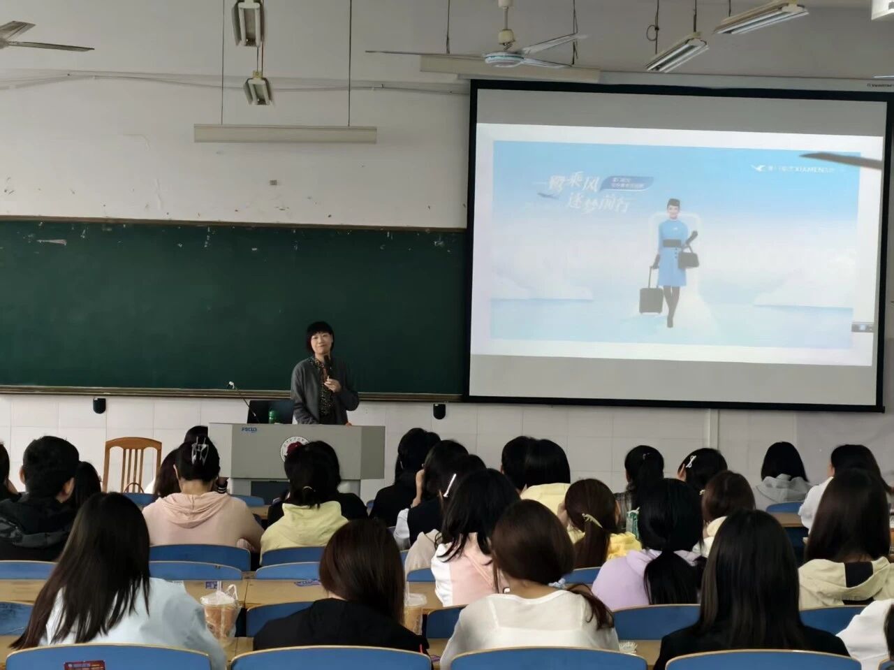 高铁空乘教研室主任孙冬玲老师简要介绍了师资团队、专业发展的行业背景、专业的培养内容和目标。并请李普一、万雪晴两位有民航从业经历的老师,分享了自己的从业故事,互动氛围热烈。最后孙老师指出,毕业生未来可在航空公司、机场、高端服务等相关领域从事乘务、地勤、客户服务等岗位工作。