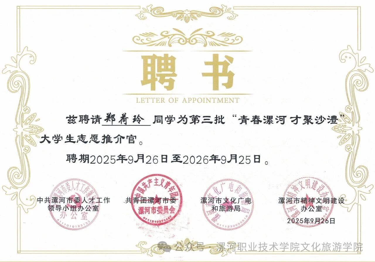 近日,从漯河市委人才办、市文明办、市文旅局、共青团市委联合举办的第三批“青春漯河 才聚沙澧”大学生志愿推介官招募活动中传来喜讯,我院郑荷玲、宋梦萱两位同学成功入选,被授予第三批“大学生志愿推介官”荣誉称号。值得一提的是,这两位同学并非漯河本地人,她们将以“新漯河人”的视角,向全国高校学子推介这座她们求学、生活的城市。