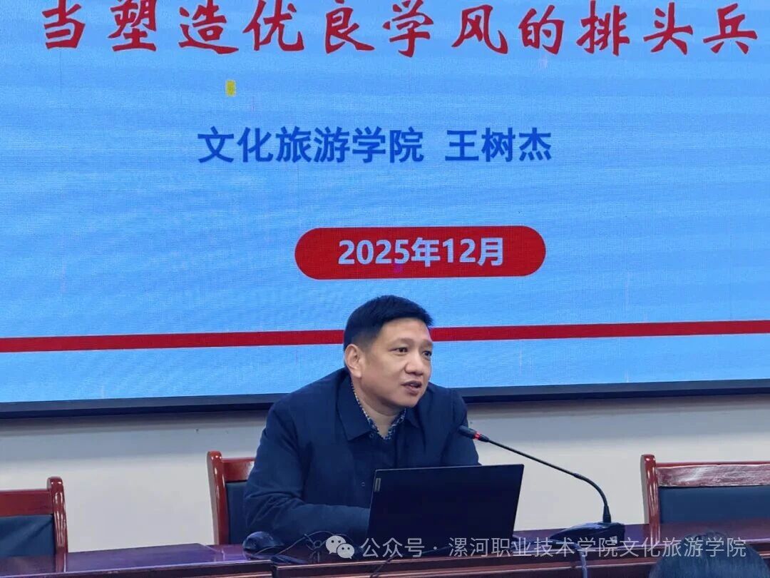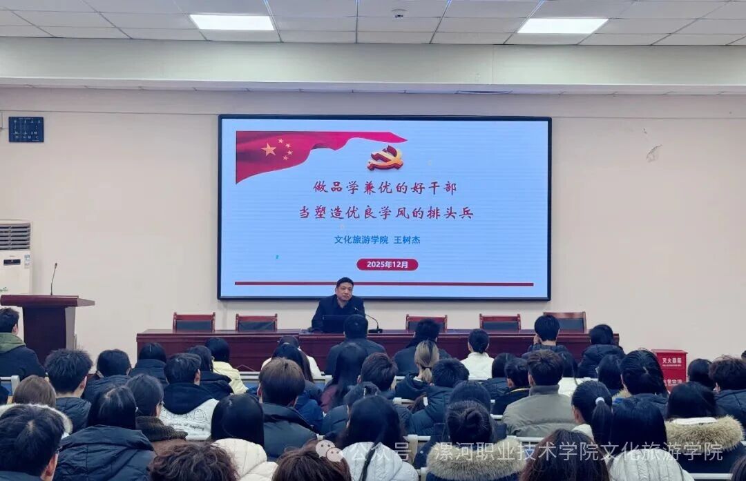 为扎实推进“抓教风促学风”常态化建设,引导学生骨干强化使命担当、发挥表率作用,12月11日,文化旅游学院党总支书记王树杰以“做品学兼优好干部,当塑造优良学风的排头兵”为主题,为全院学生干部讲授专题党课。