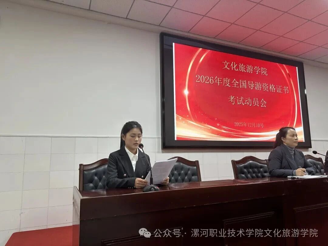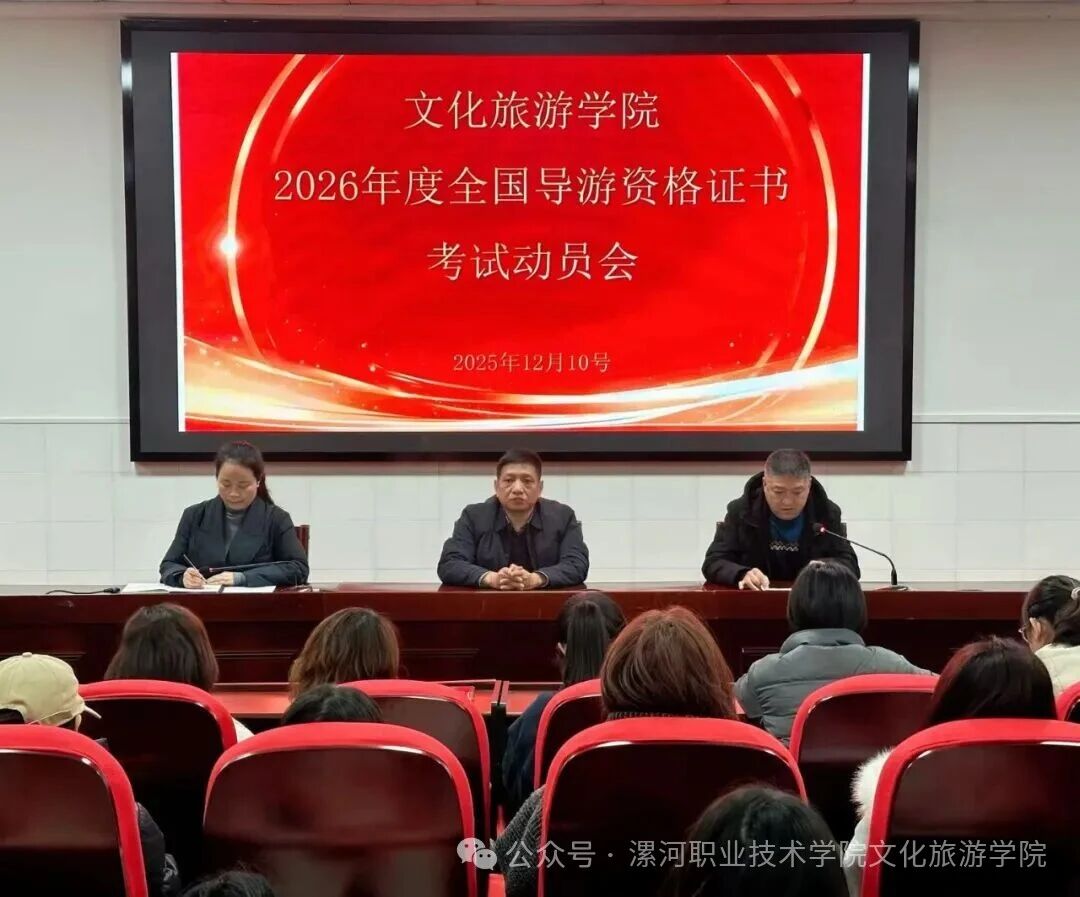 为深化“岗课赛证”育人模式对专业内涵建设的引领作用,文化旅游学院紧抓2025年全国导游资格考试结束后的重要窗口期,于12月10日在3101会议室召开2026年度全国导游资格证考试动员会,启动2025级旅游管理专业学生备考工作。学院领导班子、十余名导游资格证考试指导教师及2025级旅游管理专业120余名学生参加会议。