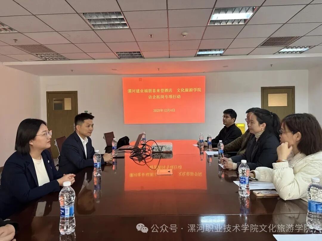12月4日,文化旅游学院副院长李晓静、党总支副书记潘智睿一行赴漯河建业福朋喜来登酒店开展访企拓岗专项调研。