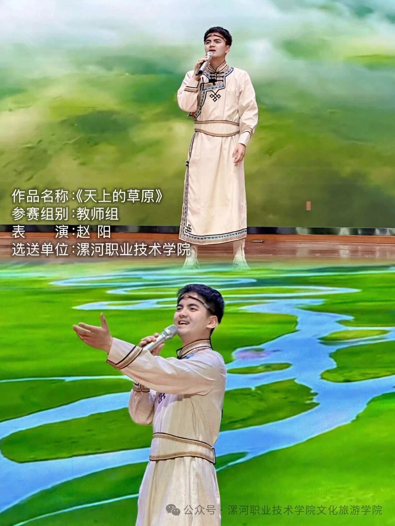 本次大赛由教育部、国家语委主办,西南大学、浙江传媒学院承办,自2024年9月启动以来,历经省级选拔、全国初赛、复赛及总决赛等多轮角逐,赛事严谨,影响广泛。赵阳老师全程倾情投入,在作品《天上的草原》的演绎中反复打磨:节奏把控精准自如,情感传递真挚动人,语言与意境交融共生。同时,他在背景视频的选取与制作上亦格外用心,通过声画结合的艺术手法,营造出沉浸式的视听体验,极大增强了作品的感染力与表现力。最终,其沉稳的台风、专业的表达与动人的音韵,深深打动了评委与观众。