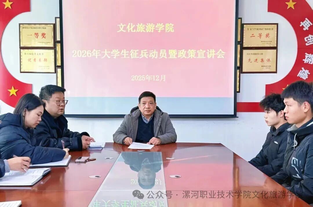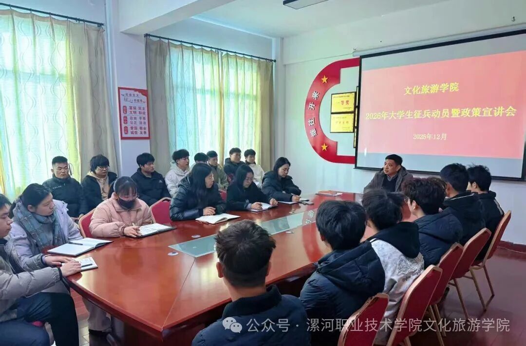 近日,文化旅游学院召开2026年大学生征兵动员暨政策宣讲会。学院党总支书记王树杰、副书记潘智睿、相关教师及学生代表共同参会。