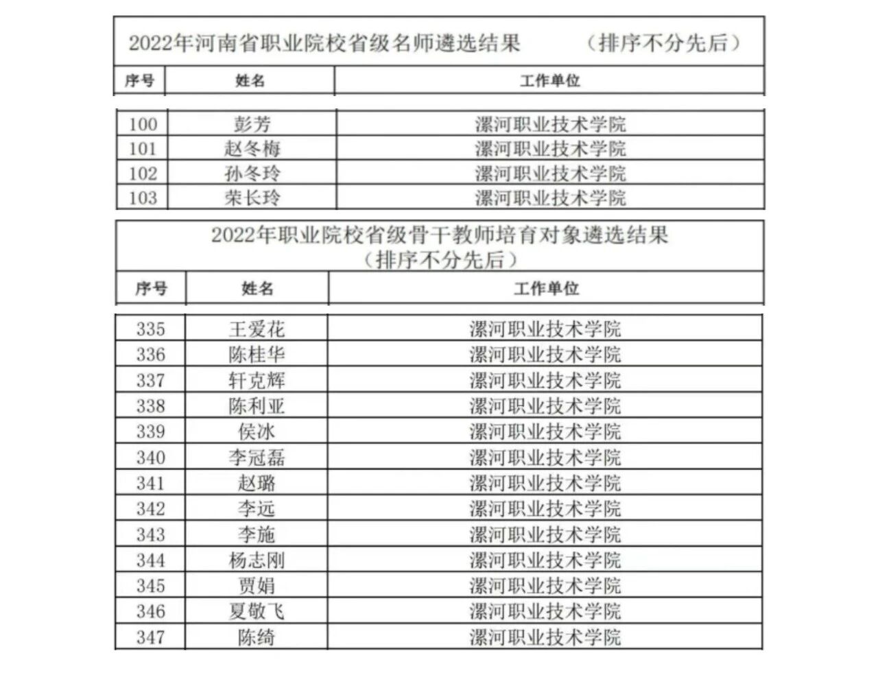 近日,河南省教育厅 河南省人力资源和社会保障厅发布了《河南省教育厅 河南省人力资源和社会保障厅关于2022年河南省职业院校省级名师和省级骨干教师培育对象遴选结果的公示》,我校赵冬梅、彭芳、荣长玲、孙冬玲4名教师入选2022年河南省职业院校省级名师培育对象,李远、赵璐、轩克辉、王爱花、陈桂华、李冠磊、陈利亚、李施、夏敬飞、陈绮、侯冰、杨志刚、贾娟13名教师入选2022年河南省职业院校省级骨干教师培育对象。