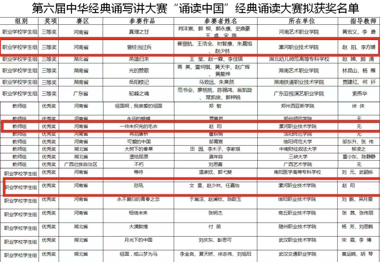 近日,由教育部、国家语委主办,中国教育电视台、浙江传媒学院承办的第六届中华经典诵写讲大赛落下帷幕。经过前期的积极部署,认真筹划和组织动员,本届比赛我院共入围国赛作品3件,是历年来入围国赛作品最多的一次。经过省赛和国赛的比拼,旅游与酒店管理系创作的作品《曾经当过兵》获得职业院校组三等奖,赵阳老师创作的作品《一件未织完的毛衣》获得教师组优秀奖,作品《怒吼》获得职业院校组优秀奖,职业院校学生组获奖共275件,我院独占2件,这三部作品皆在今年九月份斩获第六届中华经典诵读大赛(河南赛区)一等奖,充分展现了我院师生深厚的文化修养和扎实的专业能力。