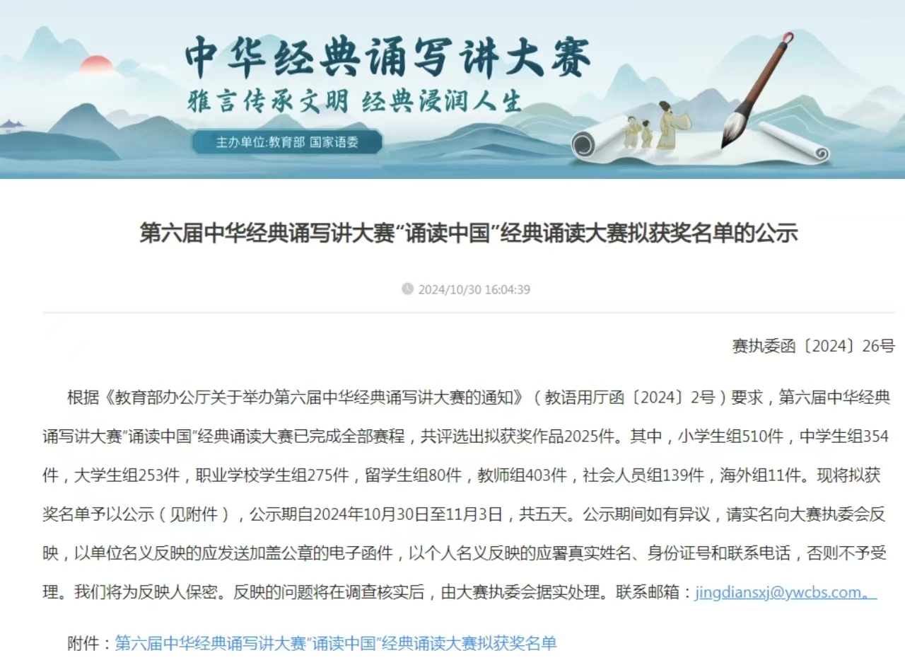 第六届中华经典诵写讲大赛是贯彻落实党的二十大精神的重要举措,旨在通过诵读古今经典,诠释中华优秀文化内涵,彰显中华语言文化魅力,弘扬中国精神。大赛自2019年起每年举办一届,已被纳入教育部的高校大学生学科竞赛清单,是该清单中唯一一项以中华经典为内容的比赛。