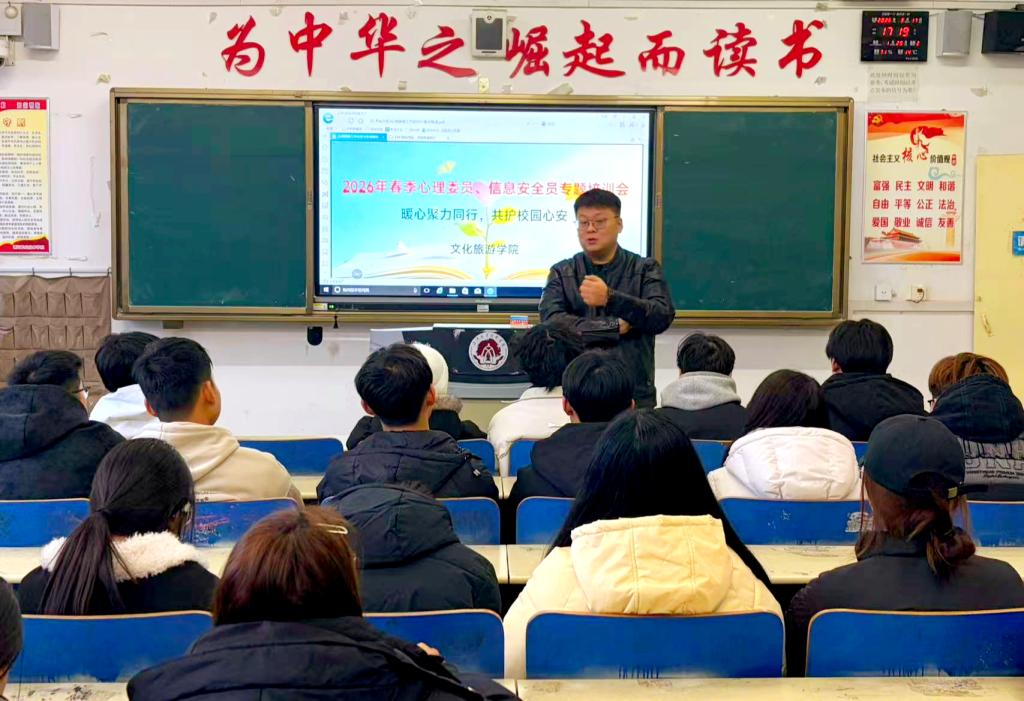 为进一步筑牢校园心理健康防线,3月25日,文化旅游学院以“暖心聚力同行,共护校园心安”为主题,组织召开心理委员及信息安全员专题培训会。全院各年级心理委员齐聚一堂,共同开启新学期“心灵守护”的新征程。